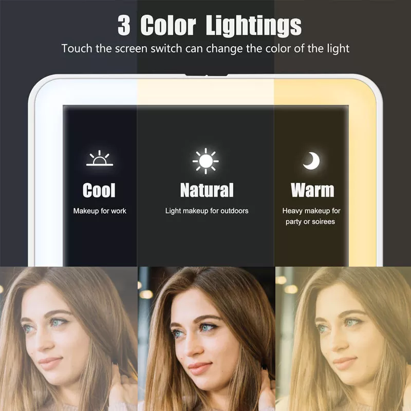 اس ٹیبل ٹاپ لیڈ میک اپ مرر میں میک اپ کے تمام منظرناموں کے مطابق تین ایڈجسٹ لائٹ موڈز (ٹھنڈا، قدرتی، گرم) شامل ہیں۔ ٹھنڈی روشنی کام کے میک اپ کے لیے مثالی ہے، بیرونی شکل کے لیے قدرتی روشنی، اور شام کے واقعات کے لیے گرم روشنی۔ نرم، ٹمٹماہٹ سے پاک ایل ای ڈی رنگ حقیقی سے زندگی کی رنگین رینڈرنگ فراہم کرتا ہے، مدھم ماحول میں بھی میک اپ کے عین مطابق اطلاق کو یقینی بناتا ہے۔