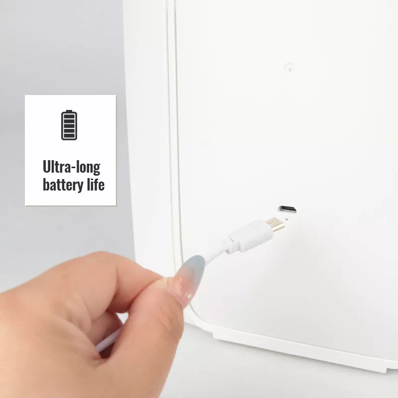 بلٹ ان ریچارج ایبل بیٹری سے تقویت یافتہ، یہ آئینہ USB-C فاسٹ چارجنگ کو سپورٹ کرتا ہے اور طویل استعمال کے لیے انتہائی طویل بیٹری لائف پیش کرتا ہے۔ بار بار ریچارج کرنے کی ضرورت نہیں ہے، جو اسے روزانہ گھریلو استعمال اور طویل سفر دونوں کے لیے قابل اعتماد بناتی ہے۔ توانائی کی بچت والا ایل ای ڈی ڈیزائن بھی بجلی کی کھپت کو کم کرتا ہے۔